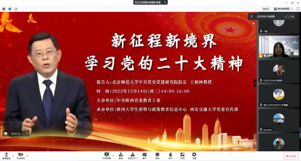 12月14日下午,信息与通信工程学院党委组织全院师生党员在西安交通大学“思源直播平台”上线上聆听北京师范大学中共党史党建研究院院长王炳林教授作题为“新征程新境界学习党的二十大精神”报告会。