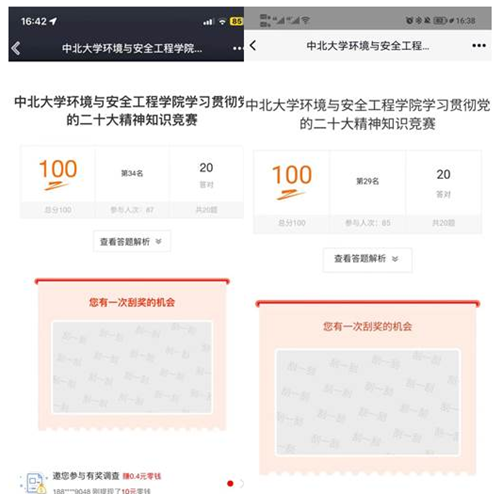 为深入学习贯彻落实党的二十大精神,引导学院师生认真学习领会党的二十大精神实质,营造“比学赶超”的浓厚学习氛围,2022年12月,环境与安全工程学院组织开展了“学习贯彻党的二十大精神”网络知识竞赛活动。此次竞赛内容涵盖了中国共产党党史、《中国共产党章程》、党的二十大报告等内容,营造了“以考促学、以学验知、以知笃行”的浓厚学习氛围,进一步激发了广大党员同志们的学习热情,加深了大家对党史、党章、党纪、党的二十大精神的认识与理解,巩固检验了党史学习教育常态化的学习教育成果。