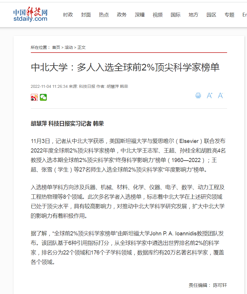11月3日,记者从中北大学获悉,美国斯坦福大学与爱思唯尔(Elsevier)联合发布2022年度全球前2%顶尖科学家榜单,中北大学王志军、王超、孙桂全和胡胜亮4名教授入选本期全球前2%顶尖科学家“终身科学影响力”榜单(1960—2022);王超、张雪(学生)等27名师生入选全球前2%顶尖科学家“年度影响力”榜单。
