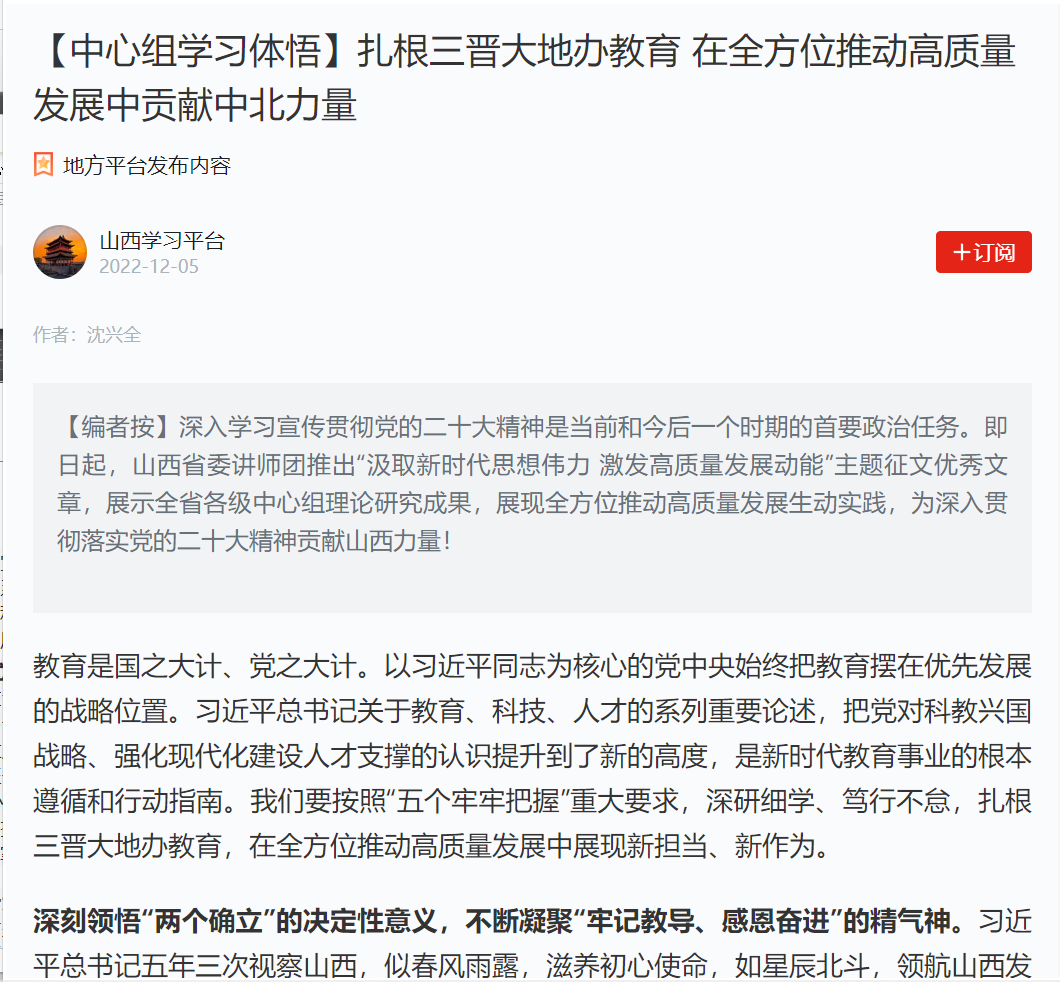 面向未来,校党委将牢记领袖殷殷嘱托,把学习宣传贯彻党的二十大精神作为当前和今后一个时期的首要政治任务,推动党的二十大精神走深走实,始终做到“三个务必”,“像钢铁一样坚定、坚诚、坚实、坚韧、坚劲”,引领师生投身全方位推动高质量发展壮阔实践,为奋力谱写全面建设社会主义现代化国家山西篇章而不懈奋斗!(沈兴全)